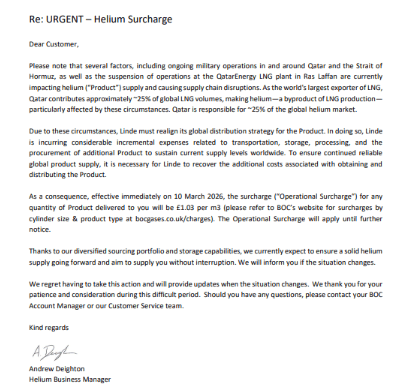 Given the escalating military situation in the Middle East around the Straits of Hormuz, we have been informed by BOC of a requirement to implement a temporary operational surcharge on Helium with immediate effect from today, March 10th. Attached is a copy of the letter being distributed to end-user customers today which provides further geopolitical context and how the suspension of operations at Qatari oil-refineries is unfortunately affecting the supply of Helium which is a by-product of Liquid Natural Gas production.